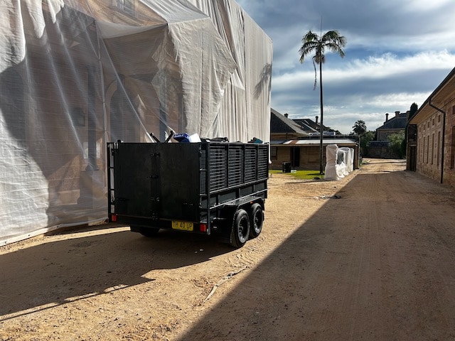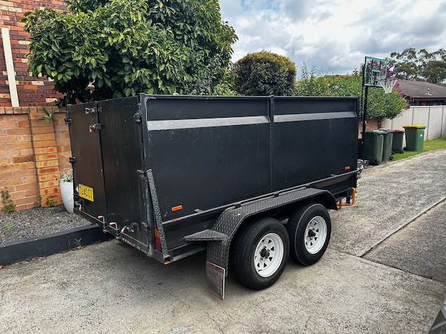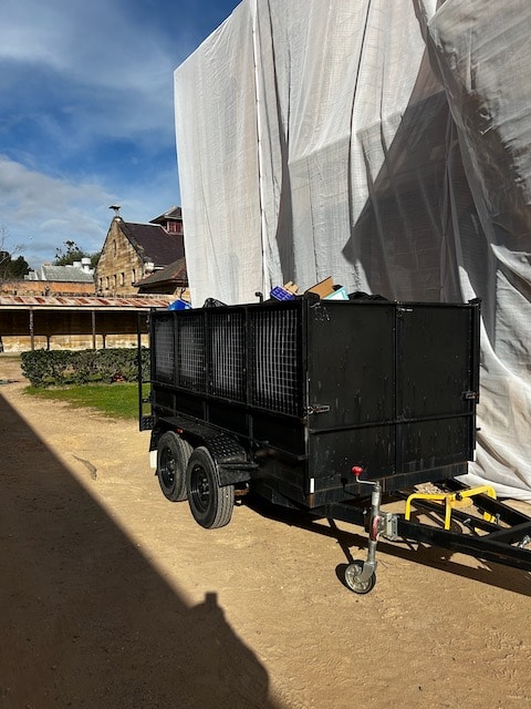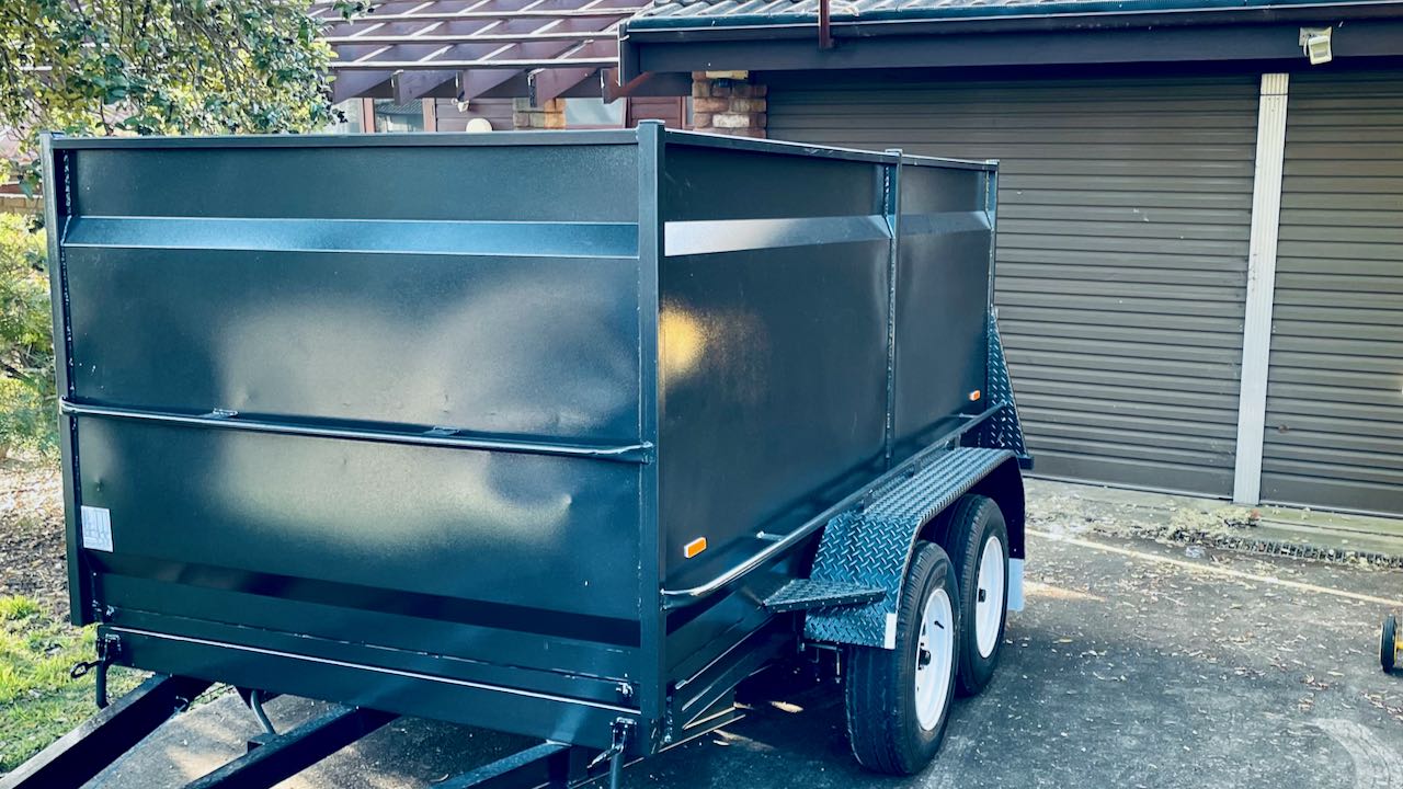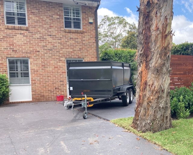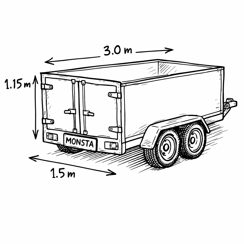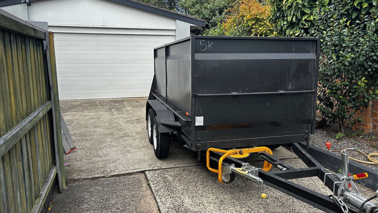 To keep your load safe and compliant, place heavier items over the trailer axles and spread weight evenly across the bin. Keep all materials below the rim so the load can be safely secured and transported. This 5m³ trailer skip is 3.0 metres long, so pack smaller loose items first and stack larger but lighter items on top to maximise usable volume. Avoid loading dense materials like bricks, tiles, concrete or soil into this bin, as they exceed permitted weight limits for this size. The maximum load allowed for a 5m³ trailer skip is 1500 kilograms.